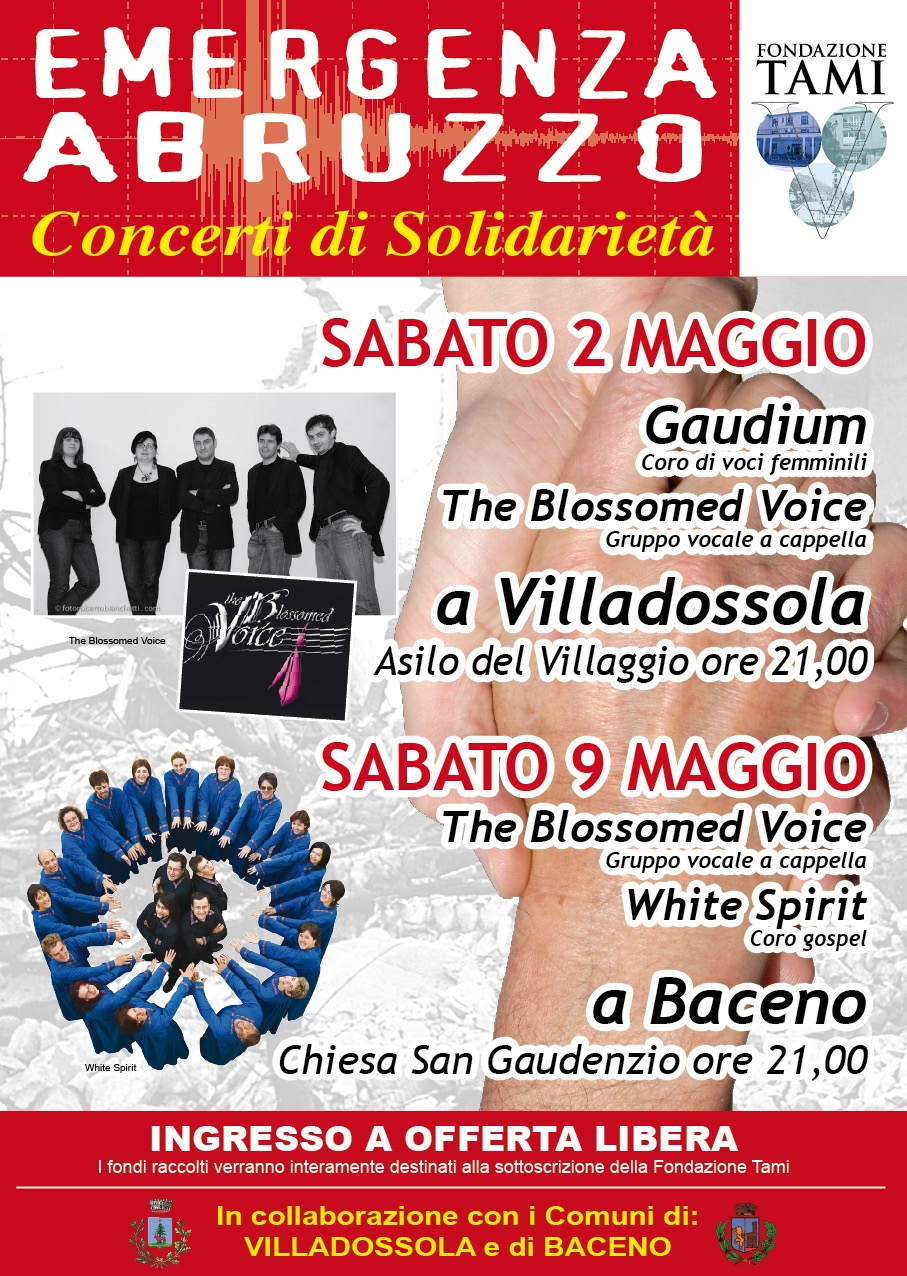 "The Blossomed Voice" gruppo vocale a cappella e il coro gospel "White Spirit" h. 21.00 presso la Chiesa di S.Gaudenzio per una serata di solidarietà a favore dell'Abruzzo.