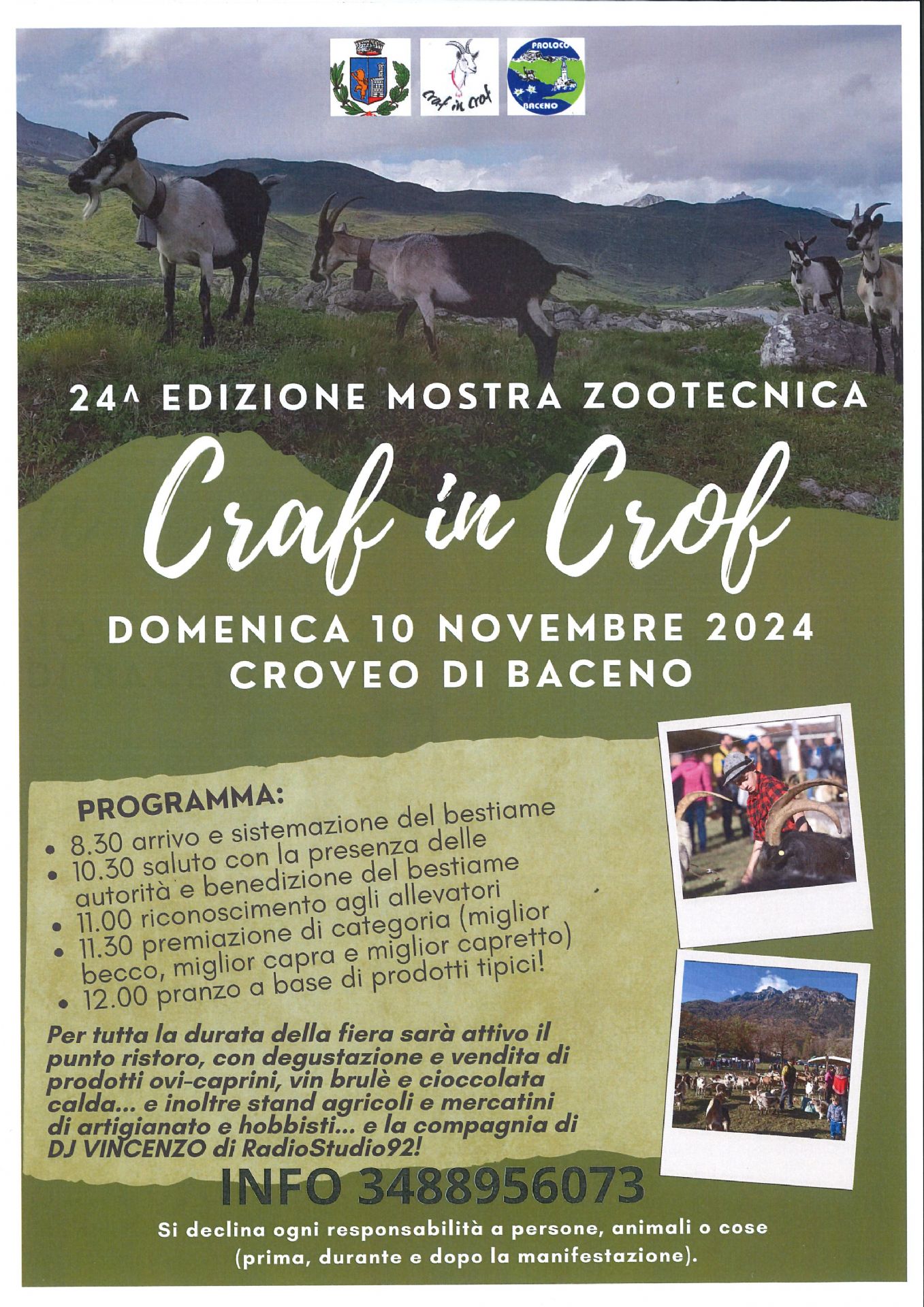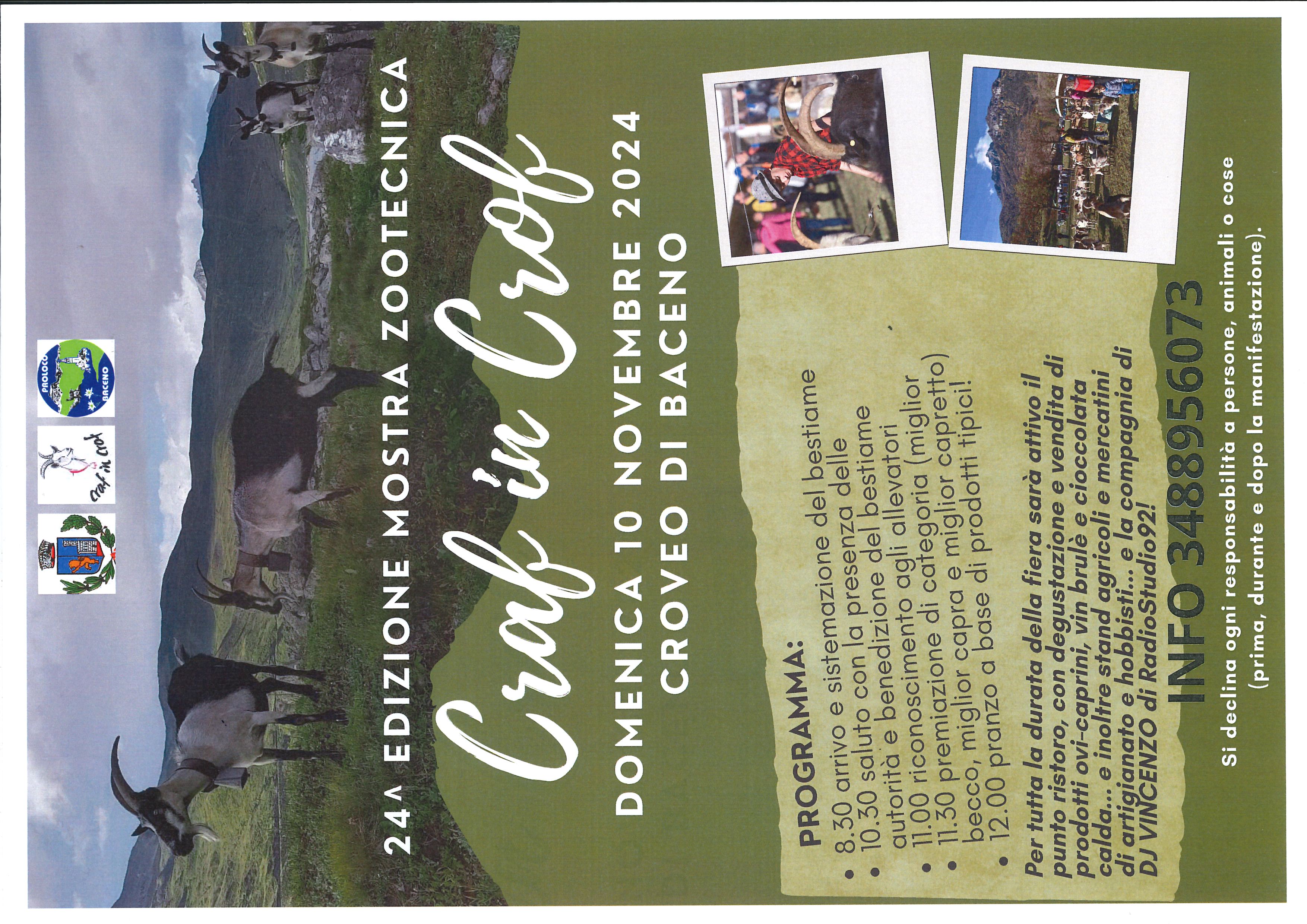"Capre in Croveo, Craf in Crof: un titolo legato alla tradizione dialettale di questo estremo angolo di Piemonte che vuole rappresentare le radici di un allevamento, quello di pecore e capre, che ancor oggi è fonte di sostentamento per molte famiglie di allevatori. Ogni anno centinaia di capre e pecore, con piccoli al seguito, giungono a Croveo per farsi ammirare. Per il pubblico gustosi assaggi ovi-caprini e dimostrazione delle tecniche di allevamento e delle varie lavorazioni dei prodotti tipici.