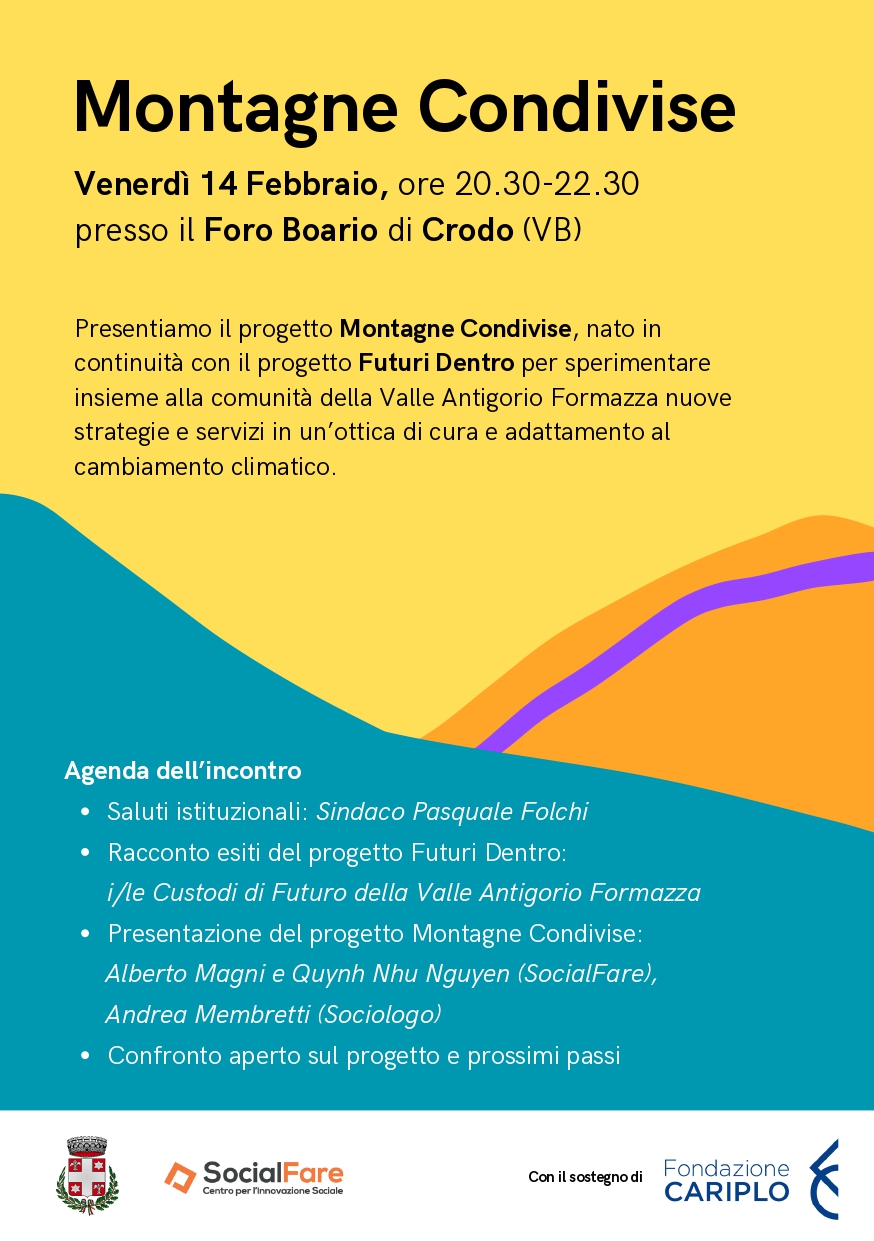Per farlo, amministrazioni locali, associazioni, soggetti privati e cittadini, saranno accompagnati da SocialFare IS in un percorso di incontri partecipativi volti a definire collettivamente una serie di servizi da sperimentare nel territorio della Valle Antigorio Formazza e identificare possibili risposte ai bisogni della comunità in un’ottica di cura e adattamento al cambiamento climatico.