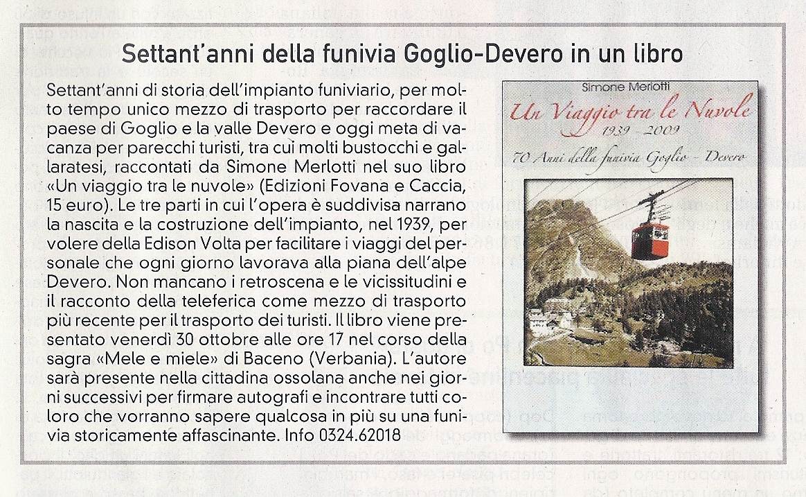 In occasione dell'inaugurazione della Sagra Mele Miele verrà presentato il nuovo libro che narra della storica funivia che da Goglio portava all'Alpe Devero.