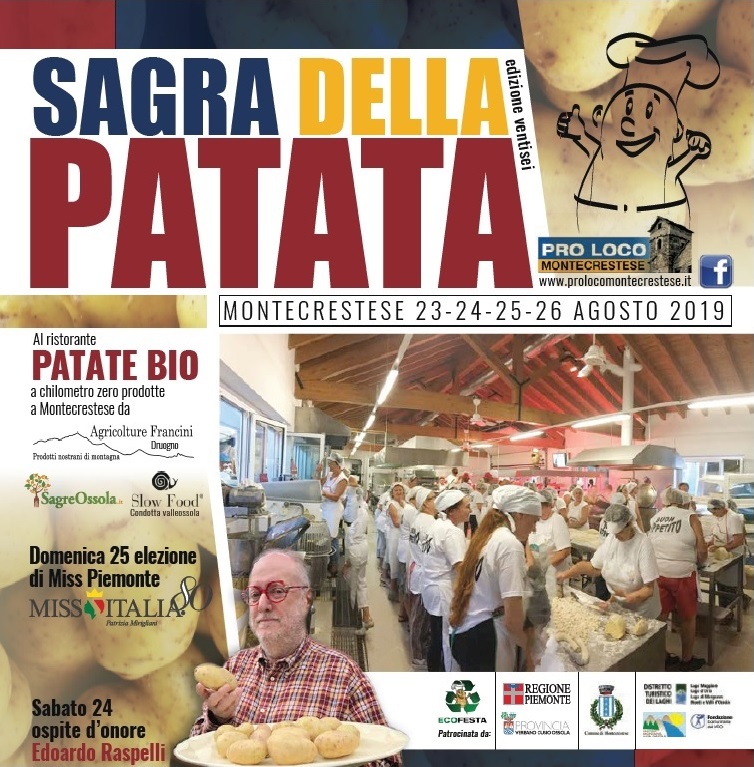 Un classico appuntamento delle sagre piemontesi, divenuto ormai uno dei più importanti ed apprezzati in tutto il Piemonte, all’avanguardia nel campo del rispetto dell’ambiente, della cultura del riciclo e dell’offerta di prodotti locali di qualità. Da alcuni anni la patata, protagonista della Sagra, è coltivata interamente sul territorio di Montecrestese in collaborazione con l’azienda agricola Francini, praticamente a 500 metri da dove si svolge la manifestazione. Un ulteriore riscontro per la qualità portata in tavola e la scelta di un approccio “sostenibile” della manifestazione. Ma questa sensibilità verso l’ambiente non è la sola, perché già dal 2011 la scelta fu quella di diventare Ecofesta: tutti i piatti e bicchieri usati sono in Materbi, i detersivi sono certificati Ecolabel e le posate sono in acciaio.