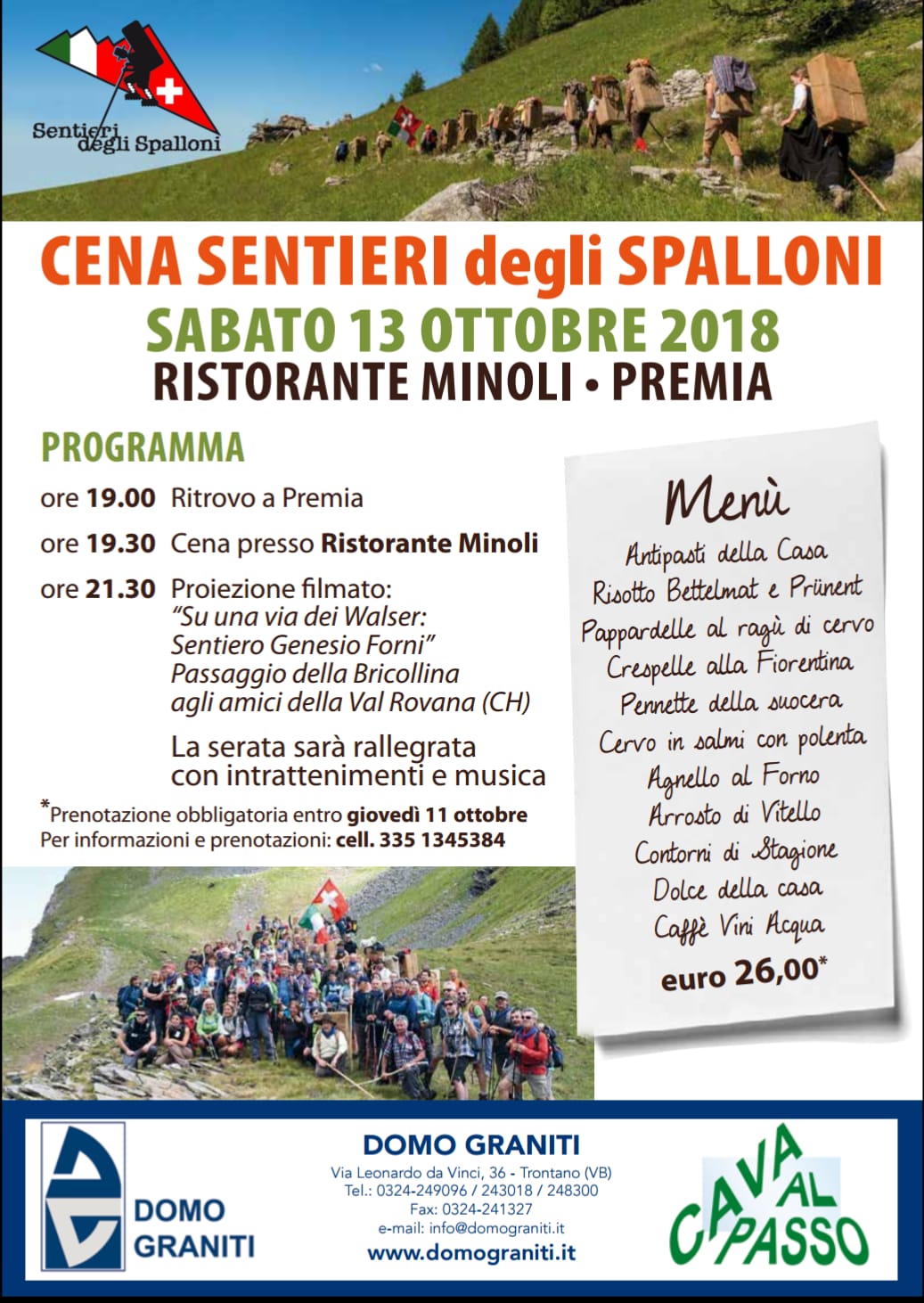 ore 19.30 Premia: Albergo Ristorante Minoli "Cena in compagnia degli Spalloni";