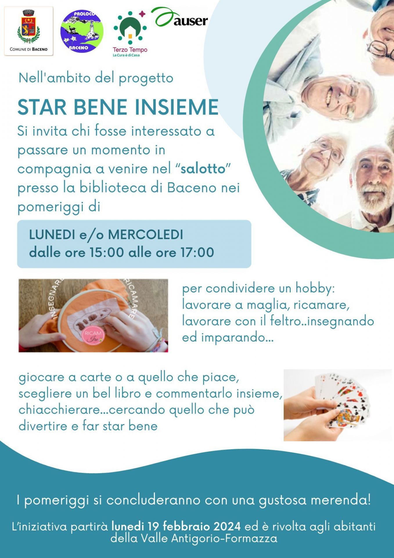 Invito ad incontri presso la Biblioteca Comunale per condividere un hobby: lavorare a maglia, ricamare, lavorare con il feltro, giocare a carte o a quello che piace, scegliere libri, chiacchierare ecc.
