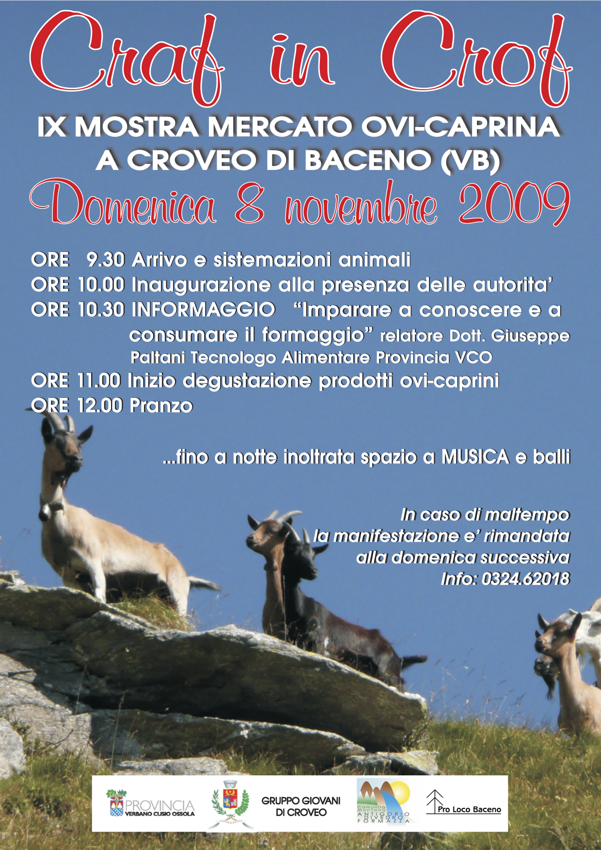 L’associazione Allevatori Ovicaprini Baceno, il Gruppo Giovani di Croveo, la Pro Loco Baceno, con la collaborazione del Comune di Baceno, della Provincia del VCO e della Comunità Montana Antigorio-Divedro-Formazza, proseguendo l’esperienza avviata negli anni precedenti, organizzano il giorno domenica 8 novembre 2009 a Croveo di Baceno la manifestazione denominata Craf in Crof.