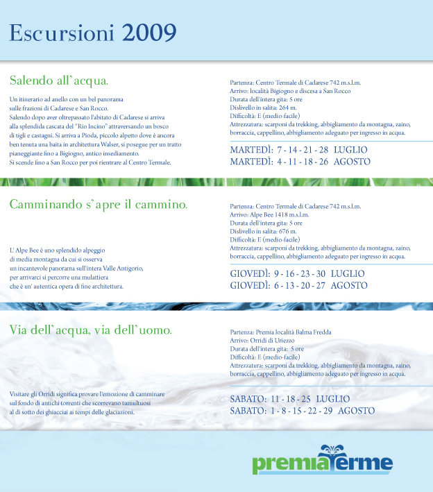 Ogni martedì, giovedì e sabato dei mesi di luglio e agosto, Premia Terme propone escursioni guidate al mattino e rilassanti pomeriggio presso il centro termale.