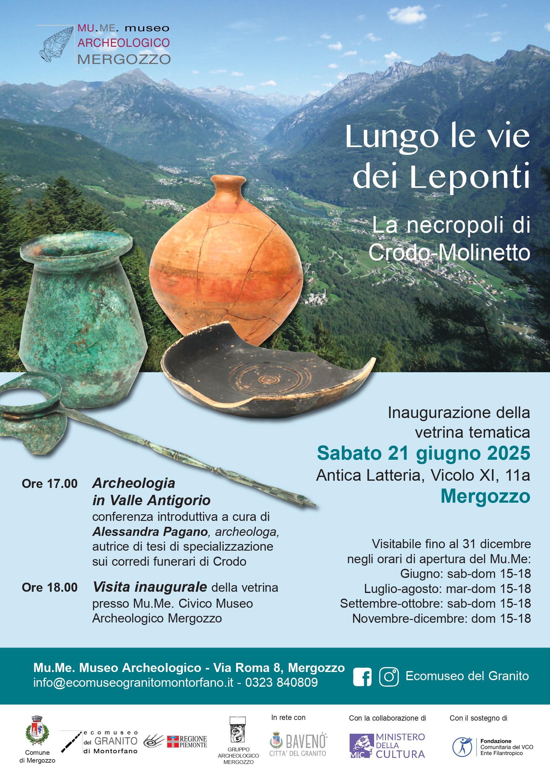 specializzazione sui corredi funerari di Crodo. Alle ore 18.00 seguirà una visita guidata inaugurale della vetrina presso Mu.Me. Civico Museo Archeologico Mergozzo.