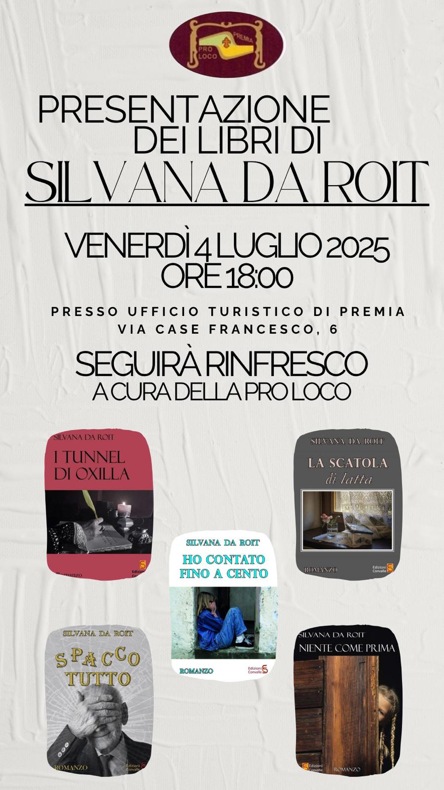 Venerdì 4 luglio 2025 alle ore 18:00 presso l'ufficio Turistico di Premia in Via Case Francesco 6 ci sarà la presentazione dei Libri di Silvana Da Roit