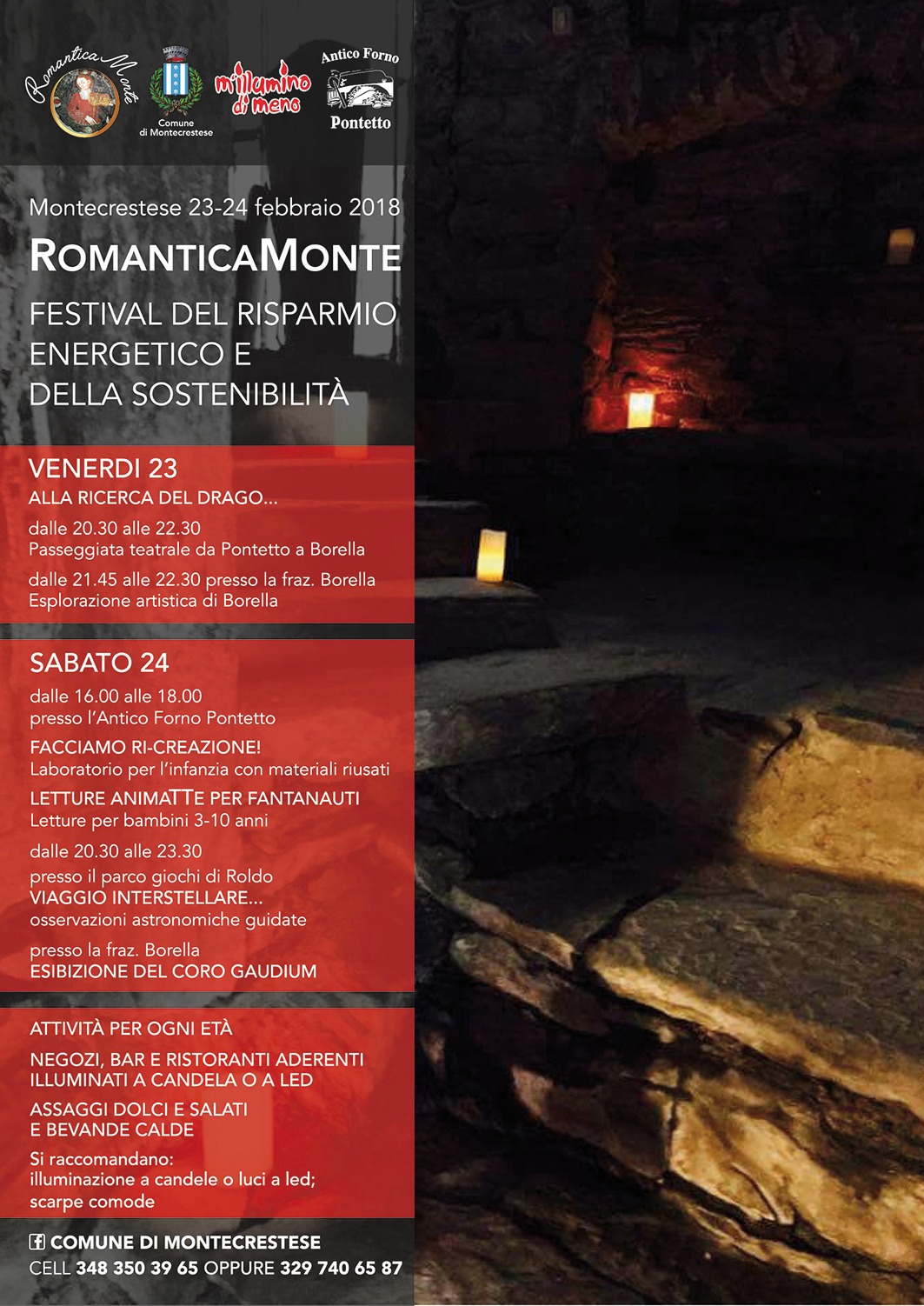 Avvisiamo di 2 cambiamenti al programma di RomanticaMonte: 1) camminata+visita Antico Forno Pontetto+ frazione Borella spostate da ven ore 20.30 a sabato ore 18.30; chi vuole raggiungere il gruppo direttamente a Borella per l'ultimo sketch senza salire a piedi può trovarsi a Borella per le 7.15; la guida resterà poi a disposizione per visitare tutta la frazione a lume di candela e per eventuale accompagnamento a scendere. 2) osservazione astronomica spostata da Roldo a Borella: in oratorio, alternandosi col coro Gaudium, APAN illustrerà cielo attraverso foto, con proiettore a batteria e non a corrente, mostrando strumenti scientifici e spiegando scelte d'illuminazione che non aumentino l'inquinamento luminoso. A Pontetto e Borella disegni delle scuole sui temi della festa. Tutto il resto assolutamente confermato, locali aderenti a lume di candela sia ven sia sab. Per infos stessi numeri indicati.