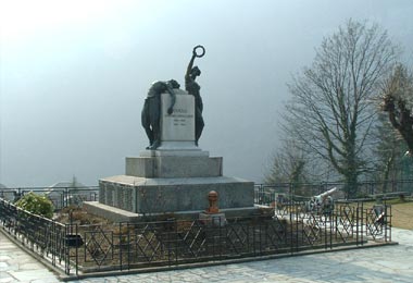 Su un basamento di due blocchi granitici sovrapposti, sormontati da un blocco di marmo bianco di Crevola, si appoggia la scultura di bronzo ad altezza maggiore del normale, rappresentante una Vittoria che, con una mano appoggiata ad un grande scudo sabaudo, tende la corona d'alloro sopra il capo di un soldato riverso sul marmo, con i calzoni, le fasce e gli scarponi militari e il giovane torso ignudo, le braccia aperte e inerti e il capo reclinato.