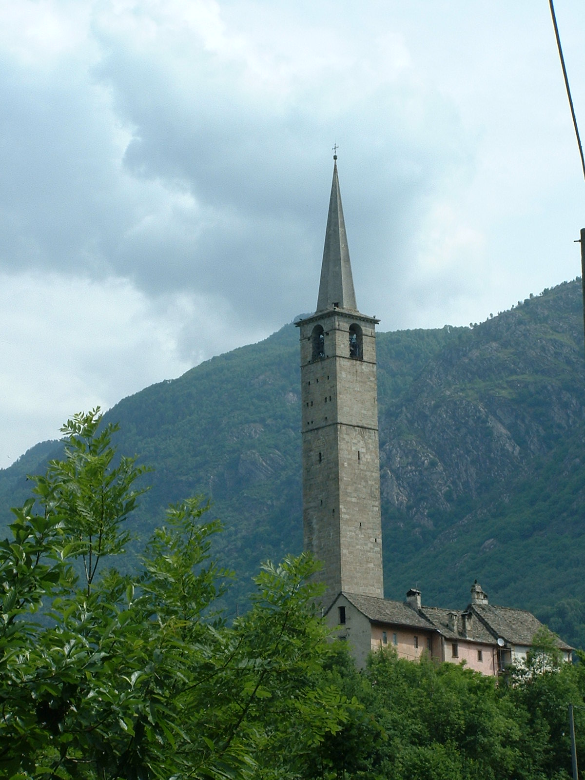 Il campanile invece, sorto poco dopo la chiesa romanica, quindi nel secolo XII, fu elevato in ben altra posizione con il chiaro intento di servire di richiamo visivo e sonoro a tutta la comunità parrocchiale. Fu infatti costruito proprio sulla cima di una roccia di sarizzo arrotondata e limata dall'antico ghiacciaio ossolano, ma saldissima, e vicinissima alle abitazioni dei parroci.