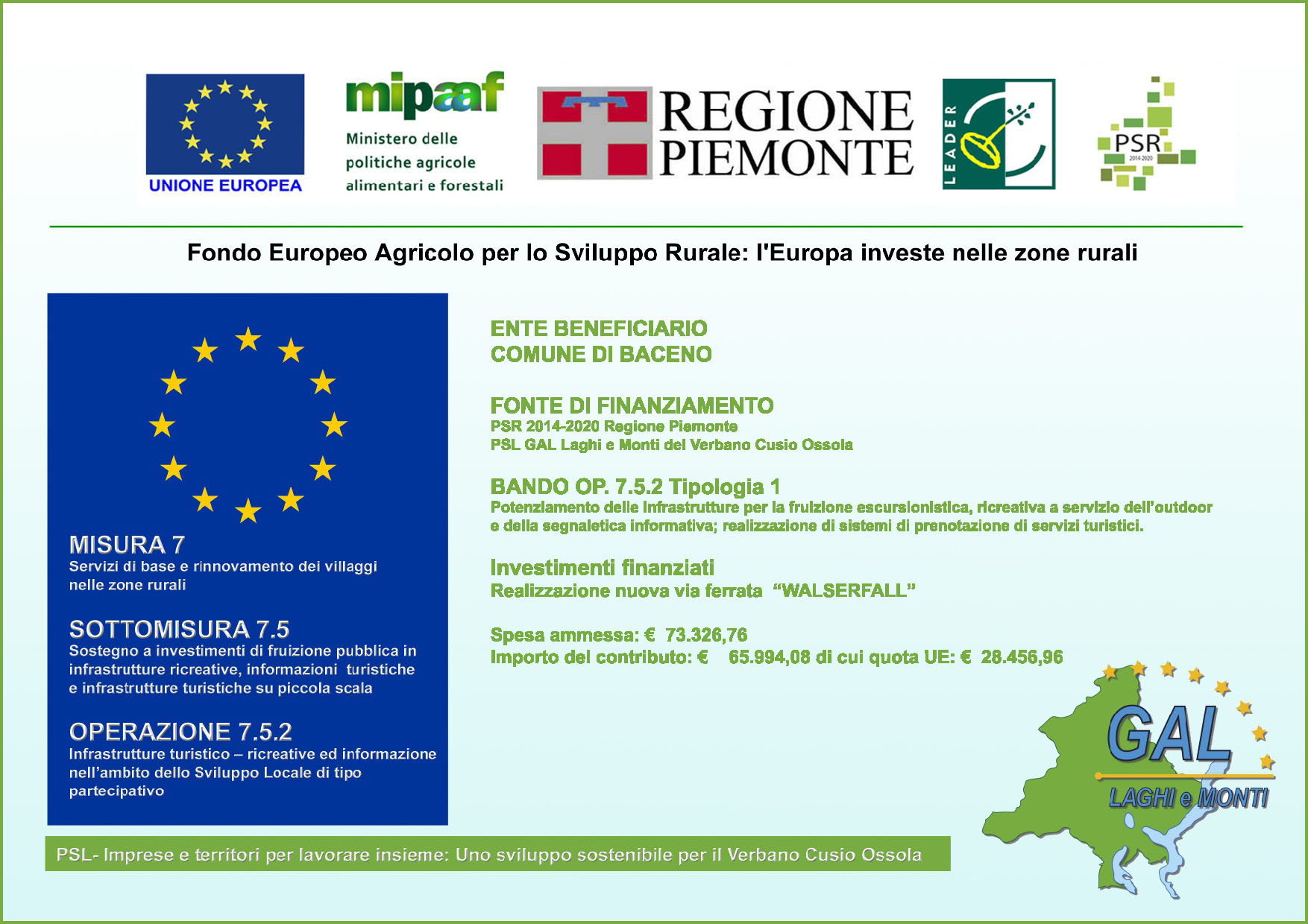 La Via Ferrata WALSERFALL si sviluppa lungo la parete rocciosa che costeggia la Cascata di Agàro, a valle dell’omonimo Lago, fino a raggiungere Piodacalva, un pugno di baite e stalle poste su un ampia e panoramica balconata rocciosa. Siamo in terra Walser e come omaggio a questo antico e sapiente popolo delle montagne è stato assegnato il nome WALSERFALL che unisce, in un gioco di parole, i termini “Walser” e “Wasserfall” (cascata).
